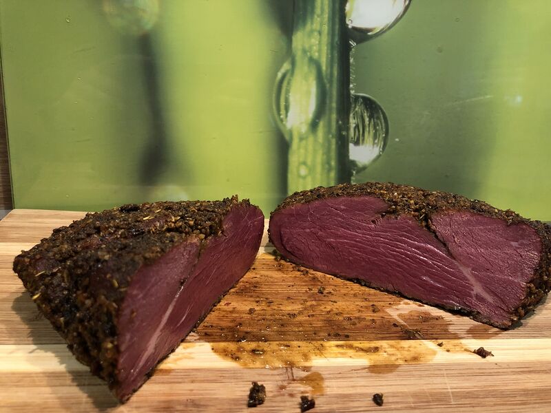 Das fertige Pastrami hauchdünn aufschneiden und mit Knoblauchsauce auf warmen Beguette genießen.