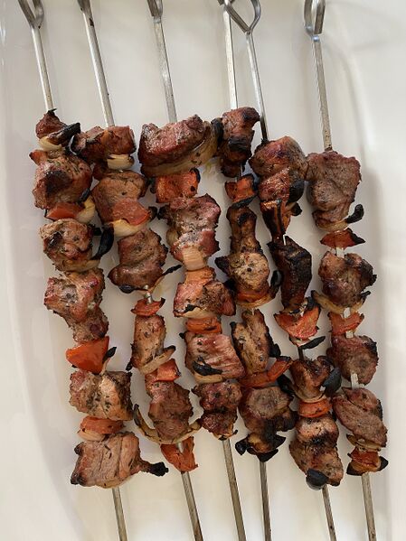 - Nach 24 Stunden Marinierzeit das Fleisch mit Zwiebeln und Tomaten im Wechsel auf die Spieße bringen.