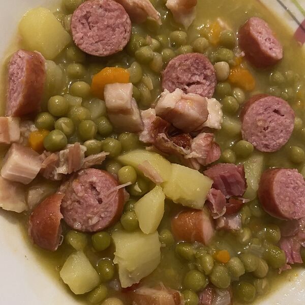 Am nächsten Tag, werden die Erbsen zusammen mit dem Knochen, dem Speck, den Möhren, dem Porree und etwas Salz im Einweichwasser langsam gar gekocht (ca. 2,5h).